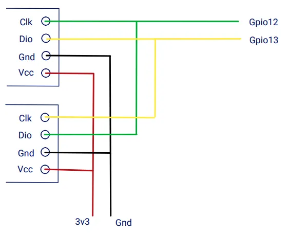 When using more than 2 devices like 3 or more you add a control-line for the Dio pin and share this with the next display Clk pin. The last displays Dio pin shares the Clk pin of the first display.